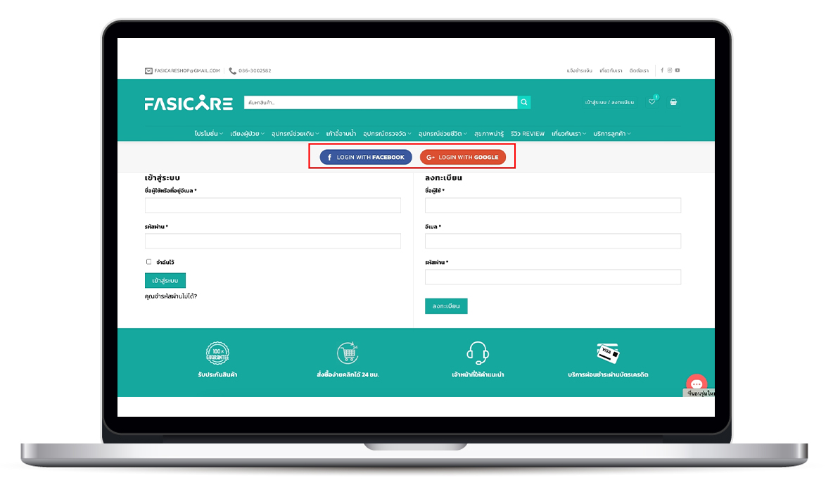 ลูกค้าสามารถเลือก เข้าสู่ระบบหรือสมัครสมาชิก ได้อย่างสะดวก ผ่านบัญชี Facebook หรือ Google เพื่อความรวดเร็ว ไม่ต้องกรอกข้อมูลใหม่ทั้งหมด